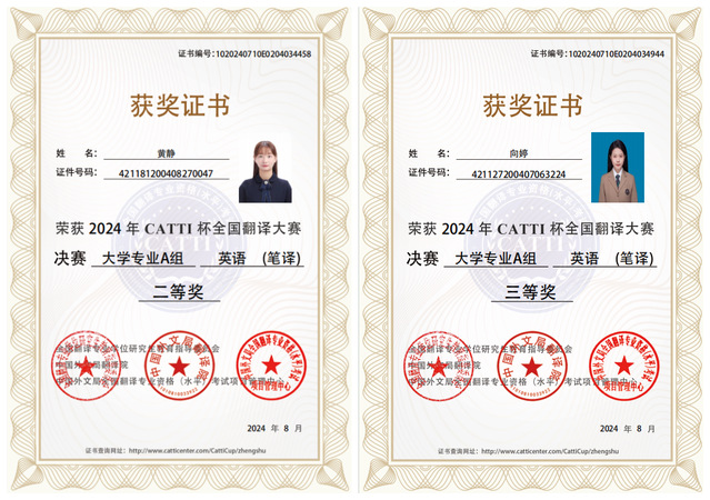 【本网讯】(通讯员 周俊博)近日,2024年CATTI杯全国翻译大赛决赛获奖名单公布。球盟会翻译2241班黄静同学荣获大学专业A组中英(笔译)二等奖,英语2242班向婷同学荣获大学专业A组中英(笔译)三等奖。