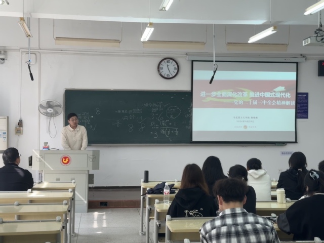 【本网讯】(通讯员谭海涛)为深入学习宣传贯彻落实党的二十届三中全会精神,10月30日上午,qmh球盟会“经叹号”青年宣讲队成员李宏杰以《进一步全面深化改革 推进中国式现代化》为题,深入球盟会商英2241班开展党的二十届三中全会精神解读的主题宣讲。