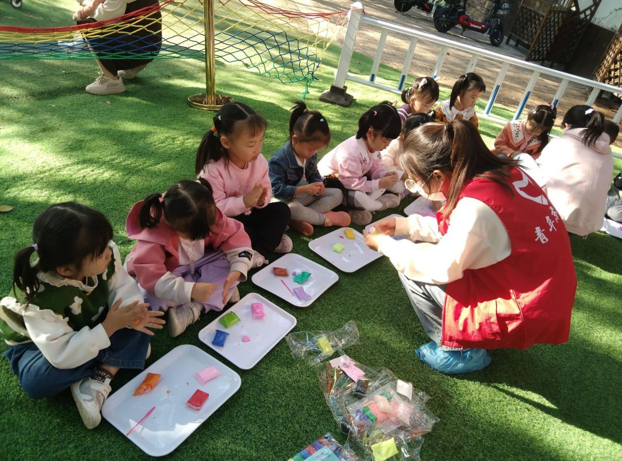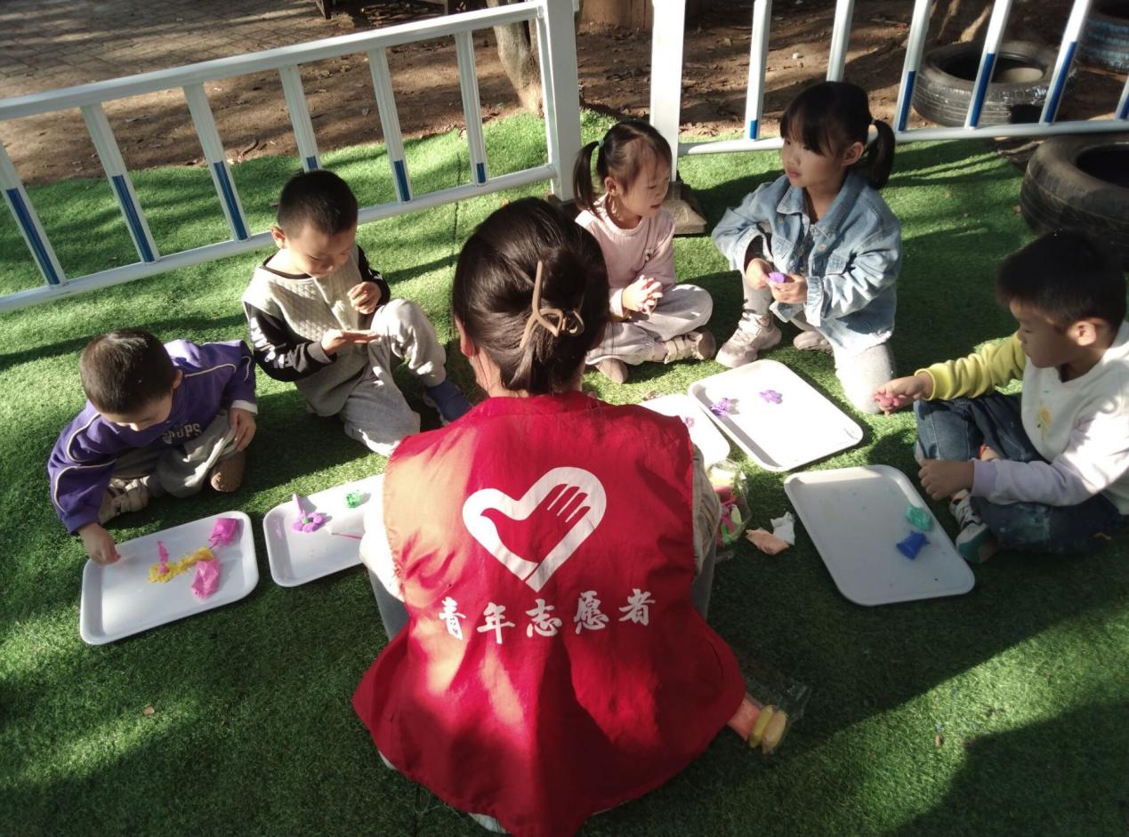 活动过程中,志愿者们分工合作,相互配合,首先向小朋友们展示了活动所需材料,介绍了手工粘土的做法,吸引小朋友们的注意。随后志愿者们带领小朋友们做粘土手工,作品完成后,对小朋友们予以赞扬与鼓励,激发他们的兴趣和热情。最后以英语的形式引导小朋友们认识手工成品,讲解相关的英语单词等,让小朋友们在动手实践中学习英语。