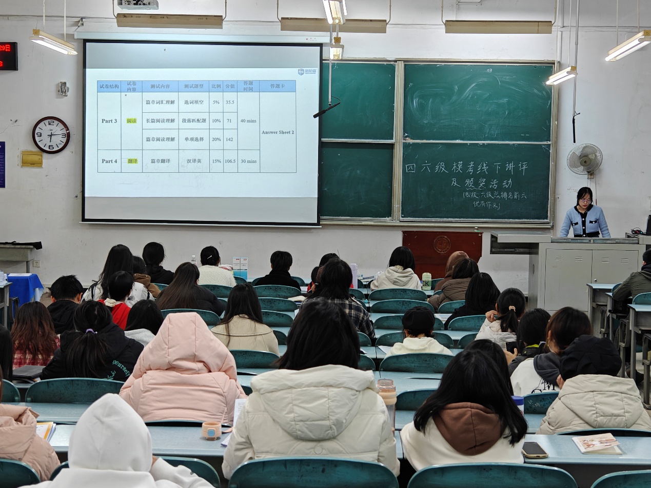 11月29日,公司在J1-101教室进行了活动颁奖和试卷讲评。首先对四级、六级模考前6名的同学分别发放了活动奖品,随后张娟娟老师从题型解析、答题技巧、时间把控等方面进行了全方位试卷讲评,帮助大家更好的理解考试逻辑。同学们纷纷表示,参加模拟考试很有收获,尤其是对于首次参加的同学提前适应很有帮助,有助于自己在接下来的备考过程中有针对性地练习。