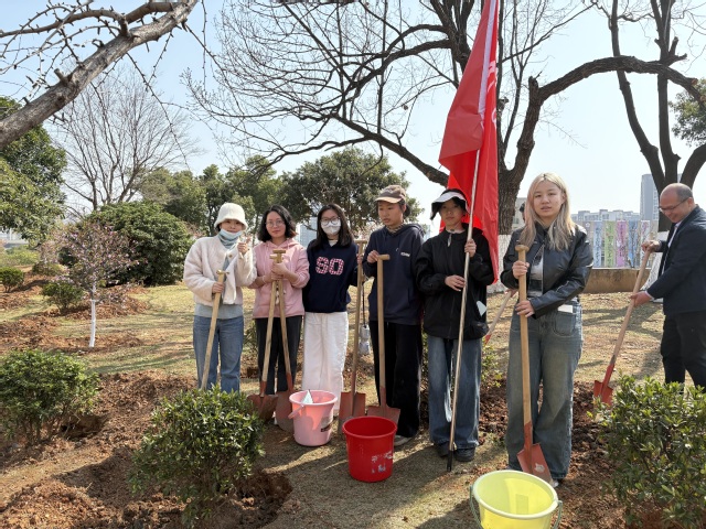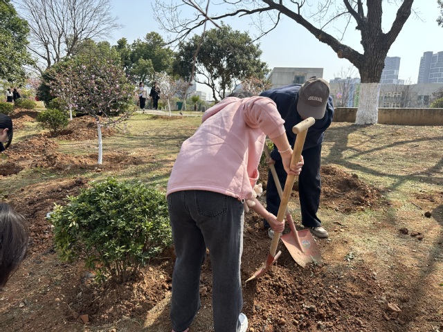 植树现场师生通力协作,完成5株杜鹃花树种植。挥锹挖土、扶苗填土、压实浇水等工序有序进行,新栽树苗为校园增添盎然春意。劳动过程中,教师们以植树如育人的比喻勉励员工,希望学子如树苗般在公司沃土扎根成长,成为兼具国际视野与人文情怀的复合型人才。