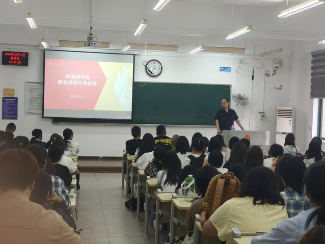 【本网讯】(通讯员胡颖 韩琪)2025年9月14日下午,球盟会商务英语专业与翻译专业分别面向2025级新生举办了专业教育讲座,为新生带来内容丰富、启迪深刻的专业“第一课”。